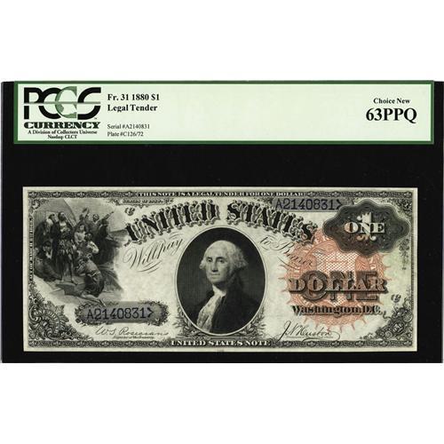 <B>Fr. 31 $1 1880 Legal Tender PCGS Choice New 63PPQ.</B></I> Against an estimate of $2,250-up, this note realized an astounding $5,175 in our most recent FUN Signature Auction. Though the quality of this note clearly speaks for itself, it was described, "Incredible color and obvious deep, original embossing highlight this scarce Large Orange Spiked Seal Blue Serial Number Ace. The note certainly gives the appearance of a far higher grade."<BR><I>From The Jeffrey L. Olyan Collection, Part 1</B></I>