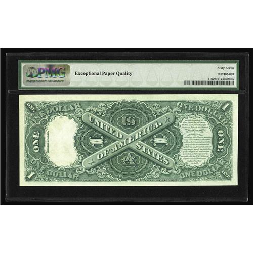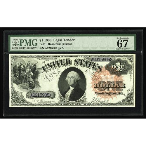 <B>Fr. 31 $1 1880 Legal Tender PMG Superb Gem Unc 67.</B></I> Off the market since December 2000, when it crossed the auction block in a Lyn Knight sale, realizing just over $4,000. This extraordinarily nice example of a rather scarce number carries the coveted "Exceptional Paper Quality" comment on the back of the PMG holder. This note in this grade could easily set a record for its number. We would expect this piece to enter into five-figures.