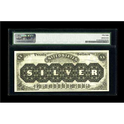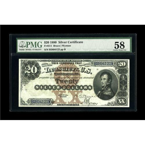 <B>Fr. 311 $20 1880 Silver Certificate PMG Choice About Unc 58.</B></I> We last sold this note in January 1997. Ten years later, a lot has happened in the paper money field, but great notes still migrate our way. We cannot see the handling through the third-party holder, but the assigned grade tells us that it is very faint. This note will still rank grade-wise in the top half dozen or so for this Friedberg number.<BR><BR><b>Shipping:</b> Coin/Currency (<a target="_blank" href="http://www.heritageauctions.com/common/shipping.php">view shipping information</a>)