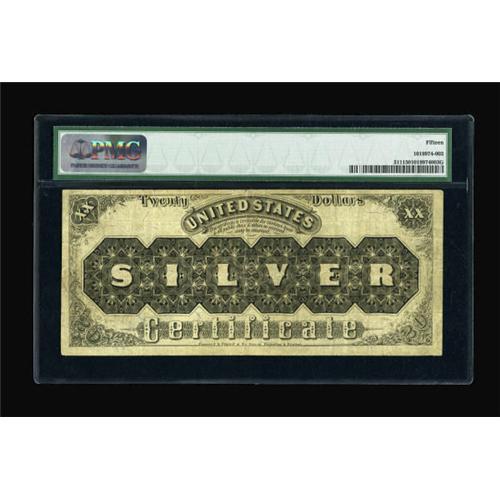 <B>Fr. 311 $20 1880 Silver Certificate PMG Choice Fine 15.</B></I> A problem-free, evenly circulated example of this scarce 1880 Steven Decatur Silver Certificate. It's decently margined, and it has strong color. This piece previously appeared in our September 2005 Long Beach Signature Auction where it realized more than $5000. With fewer examples of this popular type making auction appearances, it is likely to exceed the price realized at that sale. <BR><BR><BR><b>Shipping:</b> Coins & Currency (<a target="_blank" href="http://www.heritageauctions.com/common/shipping.php">view shipping information</a>)