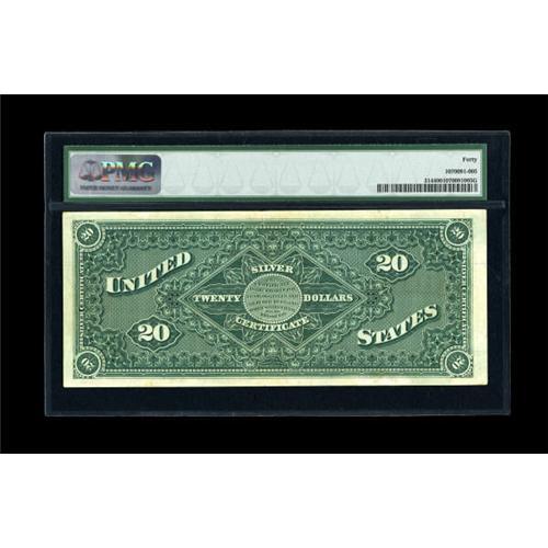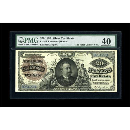 <B>Fr. 314 $20 1886 Silver Certificate PMG Extremely Fine 40.</B></I> We last sold this note in September 2004 (where it realized $12,650), and we described it then ..."Only about 130 examples are known for this type for all four varieties combined, and only about 20 of them grade EF or better. Fr. 314 is the most common of this elite group, with over 60 examples known. But not even one uncirculated note exists, and only four or five notes are as nice as this one. The margins are broad and even, and the ink and paper colors are perfection. There is a single center fold, and there are two much lighter folds, but the note gives the appearance of an uncirculated piece, with its razor-sharp printing and perfect, clean surfaces. A very, very pretty example of a rare and desirable type." It now resides in a PMG 40 holder, and, with over three years to appreciate, we would expect it to just about double its previous realization. <BR><I>From The Peter Gamble Collection.</B></I><BR><BR><b>Shipping:</b> Coins & Currency (<a target="_blank" href="http://www.heritageauctions.com/common/shipping.php">view shipping information</a>)