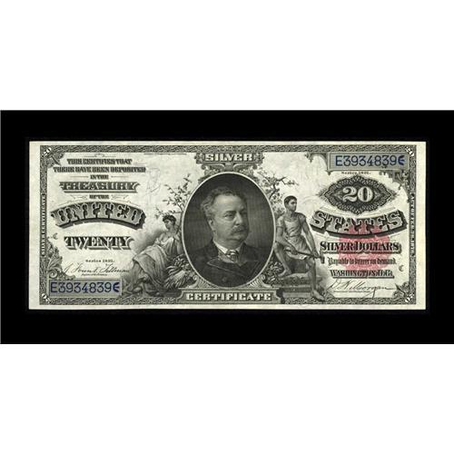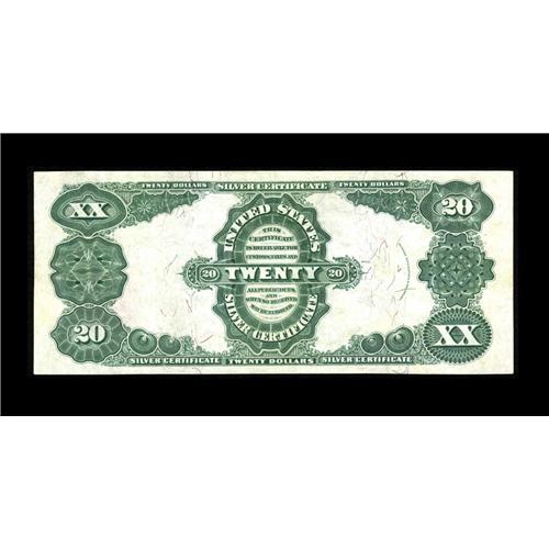 <B>Fr. 318 $20 1891 Silver Certificate Extremely Fine.</B></I> Three folds are noted at the usual positions. The overall eye appeal is not dramatically affected by the professional repair in the right margin.<BR><I>From The Bill and Kathy Stella Currency Collection</B></I><BR><BR><b>Shipping:</b> Coin/Currency (<a target="_blank" href="http://www.heritageauctions.com/common/shipping.php">view shipping information</a>)