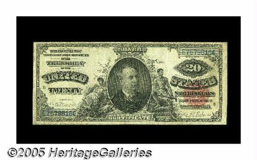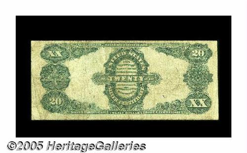 <B>Fr. 319 $20 1891 Silver Certificate Fine+.</B></I> When this type is seen, it is typically the far more available Fr. 318, with a census of roughly 125, rather than this scarce number, with a known population of 45 or so. Although a couple of nearly closed pinholes are present, the nice centering and otherwise problem-free surfaces of this middle-grade circulated example should make it a piece buyers wanting an underrated signature combination of a sought-after type will want to focus their attention on. This is exactly the kind of note that regularly trades at levels higher than its technical grade might lead the uninitiated to value it at.