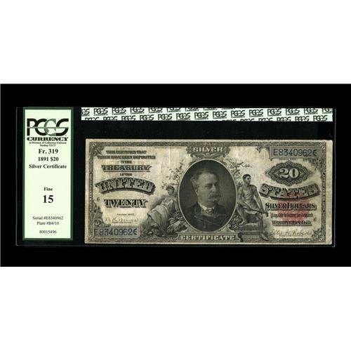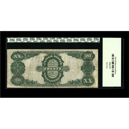 <B>Fr. 319 $20 1891 Silver Certificate PCGS Fine 15.</B></I> This Manning note has retained some color despite being in circulation as long as it was. This is a difficult note to locate and we offer three to choose from here today.