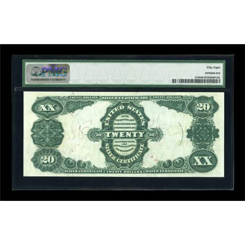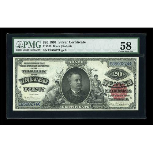 <B>Fr. 319 $20 1891 Silver Certificate PMG Choice About Unc 58.</B></I> Though the population report published by PMG is in its infancy, this piece will likely remain a condition-census example. It has a single light fold and all the eye appeal of a Gem. In its last auction appearance in 1986, it was awarded a full CU grade, which is how it is recorded in the census. As it stands, it is the finest graded by PMG to date. Only three other CU's are recorded in the census, each of which could also be AU. One of those high grade pieces is a permanent fixture in the ANA Museum in Colorado Springs. The margins are full on all sides and nearly even, and the printed details include deep blue serial numbers, a blazing red seal and complementary devices.<BR><BR><b>Shipping:</b> Coins & Currency (<a target="_blank" href="http://www.heritageauctions.com/common/shipping.php">view shipping information</a>)