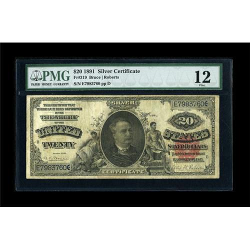 <B>Fr. 319 $20 1891 Silver Certificate PMG Fine 12.</B></I> This evenly circulated example is a little less common than Fr. 318. Overall the note maintains a pleasing appearance.<BR><BR><b>Shipping:</b> Coins & Currency (<a target="_blank" href="http://www.heritageauctions.com/common/shipping.php">view shipping information</a>)