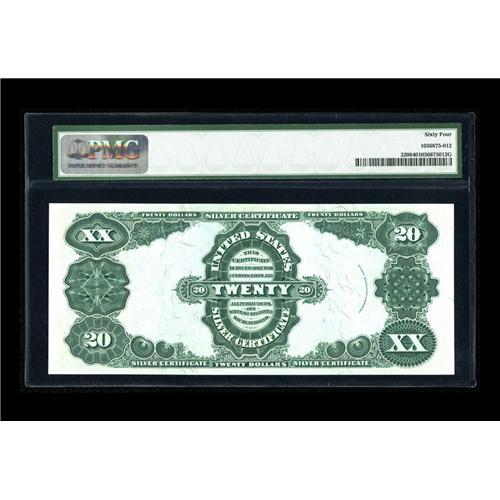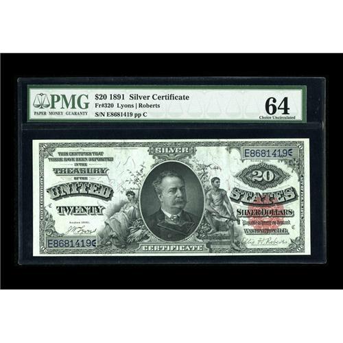 <B>Fr. 320 $20 1891 Silver Certificate PMG Choice Uncirculated 64.</B></I> Out of the 512,000 printed, fewer than 50 survivors have been traced to date. This one is quite attractive and was sold by us once before in 1997. It has huge, even margins, terrific color and tons of eye appeal. Expect this piece to realize substantially more than what it went for almost ten years ago.<BR><BR><b>Shipping:</b> Coin/Currency (<a target="_blank" href="http://www.heritageauctions.com/common/shipping.php">view shipping information</a>)