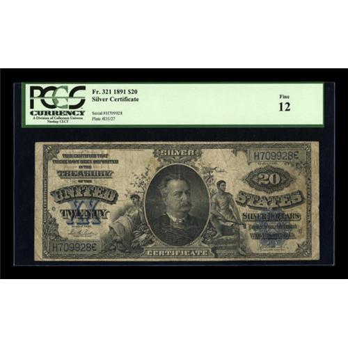 <B>Fr. 321 $20 1891 Silver Certificate PCGS Fine 12.</B></I> This Manning note is evenly circulated and has not been previously recorded in the census.<BR><I>From The Kansas City Collection.</B></I><BR><BR><b>Shipping:</b> Coins & Currency (<a target="_blank" href="http://www.heritageauctions.com/common/shipping.php">view shipping information</a>)