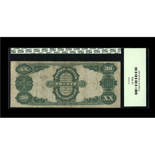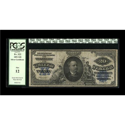 <B>Fr. 322 $20 1891 Silver Certificate PCGS Fine 12.</B></I> A nice, evenly circulated Blue Seal Twenty Dollar Silver. Fr. 322 is much the scarcer of this two-number type, being outnumbered over two-to-one by Fr. 321.