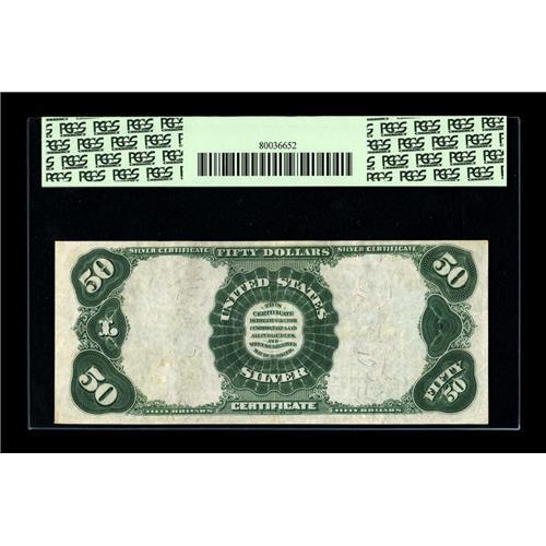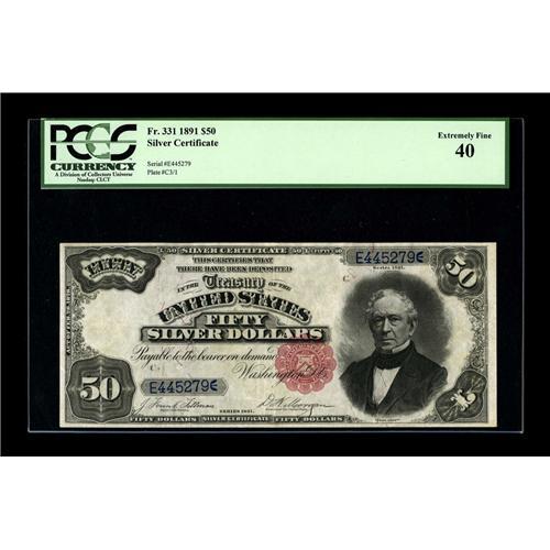 <B>Fr. 331 $50 1891 Silver Certificate PCGS Extremely Fine 40.</B></I> Only twenty-one examples of this Friedberg number are listed in the most recent census. Another PCGS 40 realized $9,200 in October 2005, and we would expect this note to easily reach, or quite possibly exceed, that level.<BR><I>From The Bill and Kathy Stella Currency Collection</B></I><BR><BR><b>Shipping:</b> Coin/Currency (<a target="_blank" href="http://www.heritageauctions.com/common/shipping.php">view shipping information</a>)