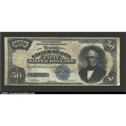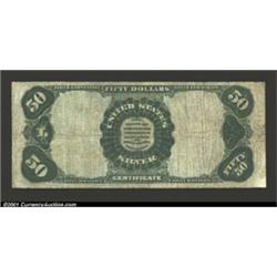 Fr. 335 $50 1891 Silver Certificate Fine-Very Fine.<p>This is a solid problem free example of a scarce and popular type. Its well margined and with better color than one would expect for the grade and its also free of the heavy circulation soil that frequently impairs well circulated higher denomination notes. It would not surprise us if this piece reached or exceeded the price of a fully Very Fine example. Important notice: We expect to be auctioning lots at the rate of 200-250 per hour. Sometimes eBay Premier live bid software cannot keep up with that pace, so we strongly recommend that you place a realistic proxy bid now as insurance to avoid disappointment. Also please note that all Heritage/CAA lots purchased through eBay Premier carry a 20% Buyer's Premium.