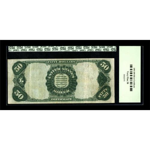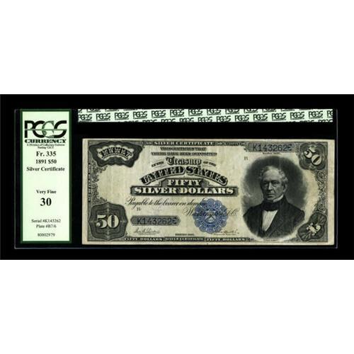 <B>Fr. 335 $50 1891 Silver Certificate PCGS Very Fine 30.</B></I> A very pleasing mid-grade example of this scarce type, with crisp, original paper and bright colors. Fr. 335 is the most common signature found on $50 Silvers, making this a perfect type example. Pictured on the note is Edward Everett, a Massachusetts Senator and Secretary of State under President Fillmore from 1852-1853. A really nice note that should inspire spirited bidding.<BR><BR><b>Shipping:</b> Coins & Currency (<a target="_blank" href="http://www.heritageauctions.com/common/shipping.php">view shipping information</a>)