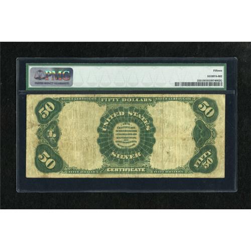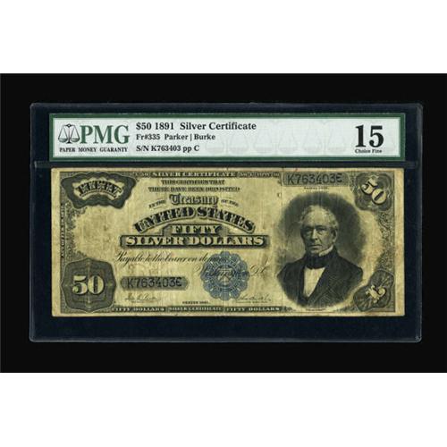 <B>Fr. 335 $50 1891 Silver Certificate PMG Choice Fine 15.</B></I> We last handled this original and problem-free note in 2005. It is solid for the grade, with good margins and excellent color.<BR><BR><b>Shipping:</b> Coins & Currency (<a target="_blank" href="http://www.heritageauctions.com/common/shipping.php">view shipping information</a>)