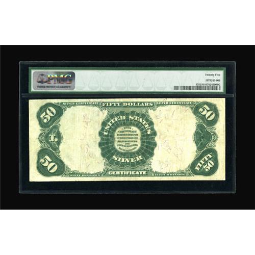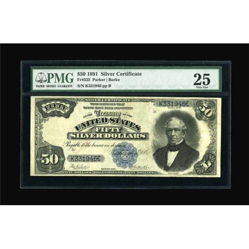 <B>Fr. 335 $50 1891 Silver Certificate PMG Very Fine 25.</B></I> Mid-grade $50 Silvers, particularly defect-free pieces such as this one, are quite difficult to locate. The margins are excellent, the colors are strong, and the note is an ideal example of the middle Very Fine grade. <BR><I>From The John Ameen Collection</B></I><BR><BR><b>Shipping:</b> Coins & Currency (<a target="_blank" href="http://www.heritageauctions.com/common/shipping.php">view shipping information</a>)