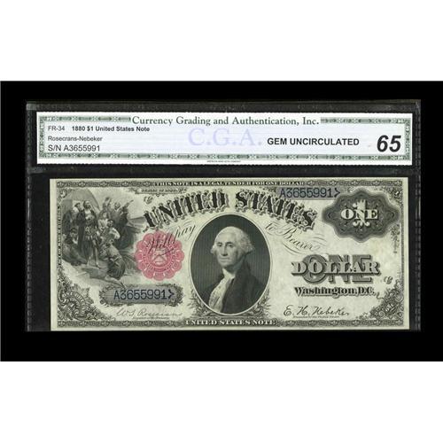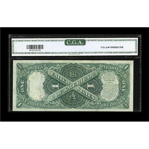 <B>Fr. 34 $1 1880 Legal Tender CGA Gem Uncirculated 65.</B></I> Nicely margined, with beautiful color and paper originality that can be seen through the third-party holder.<BR><I>From The Ross Bailey Collection</B></I>