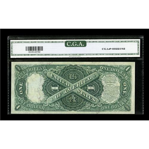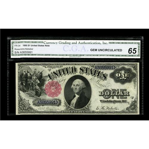 <B>Fr. 34 $1 1880 Legal Tender CGA Gem Uncirculated 65.</B></I> Nicely margined, with beautiful color and paper originality that can be seen through the third-party holder. We previously sold this note as part of the Ross Bailey Collection.<BR><BR><b>Shipping:</b> Coins & Currency (<a target="_blank" href="http://www.heritageauctions.com/common/shipping.php">view shipping information</a>)