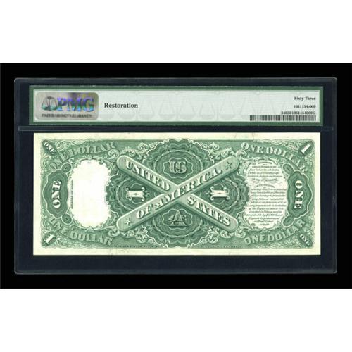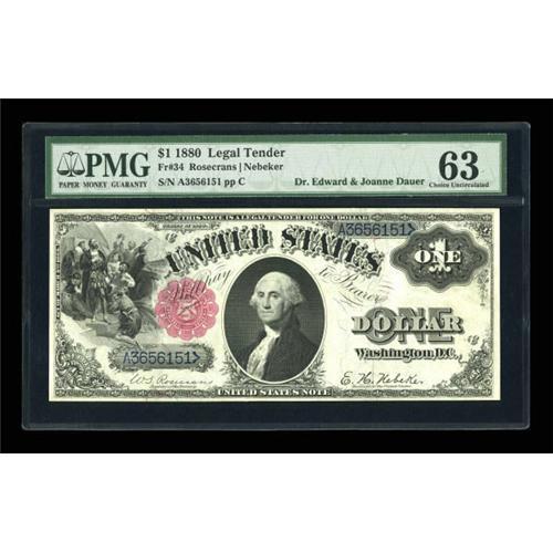 <B>Fr. 34 $1 1880 Legal Tender PMG Choice Uncirculated 63.</B></I> PMG has noted "Restoration" on their holder. The note is well margined with good color and is illustrated on page 56 of the Dauers' book. This 1880 series Ace, with its smaller red scalloped seal, is the first dollar bill with a more modern look. <BR><I>From The Dr. Edward & Joanne Dauer Collection</B></I><BR><BR><b>Shipping:</b> Coins & Currency (<a target="_blank" href="http://www.heritageauctions.com/common/shipping.php">view shipping information</a>)