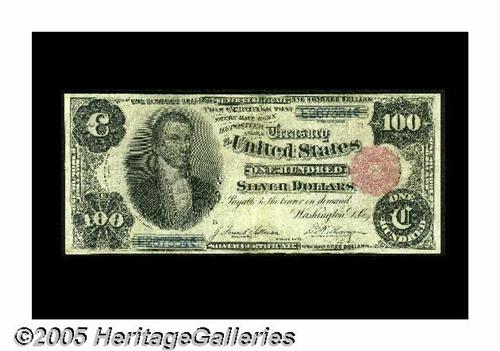 <B>Fr. 344 $100 1891 Silver Certificate Fine-Very Fine.</B></I> This one is an old friend that we sold in January of 1996. Around thirty examples are known, most of which are right around this grade. This is a totally solid piece, without a hint of repair, restoration or marks of any kind. $100 silvers that are both affordable and presentable are extremely difficult to come by, but this is just such a note.