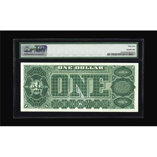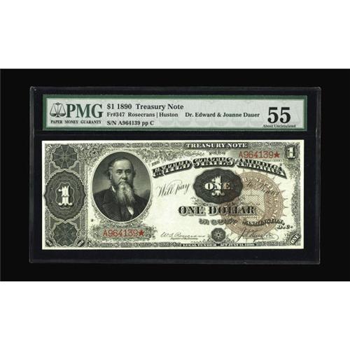 <B>Fr. 347 $1 1890 Treasury Note PMG About Uncirculated 55.</B></I> Edwin M. Stanton was Lincoln's second Secretary of War, called on by Lincoln to replace Simon Cameron. Stanton was initially a critic of Lincoln, but after the two began working closely, a tight bond developed. This 1890 note, with its large brown seal, appears on page 213 of the Dauers' book. Although short of the uncirculated grade, the note has the appearance of a perfect Gem.<BR><I>From The Dr. Edward and Joanne Dauer Collection</B></I>