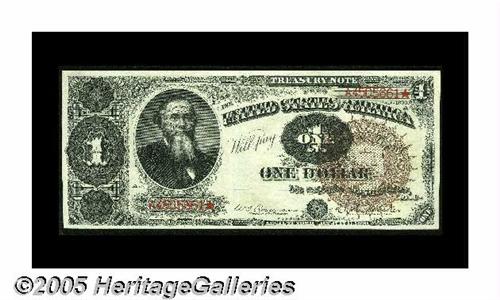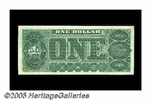 <B>Fr. 348 $1 1890 Treasury Note Superb Gem New.</B></I> Fr. 348 is by far the scarcest of the 1890 Aces. CAA has sold only fourteen examples as opposed to Fr. 347, of which we have sold 87, and Fr. 349, of which we have sold 35. These proportions hold up pretty well to the census of all notes, which shows over 200 Fr. 347's, about 30 Fr. 348's and nearly 70 Fr. 349's. Few of the 30 known examples can begin to compare to this beautiful note, with its near perfect centering, ideal colors, sharp printing quality and perfect paper surfaces. Collectors would be well advised to focus on sleeper numbers such as this, because they frequently sell for only small premiums over their more common type mates.