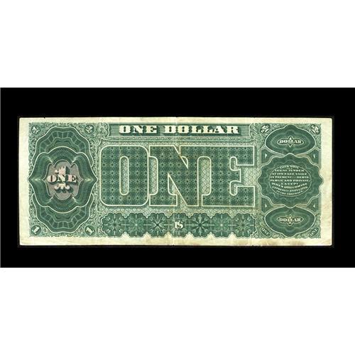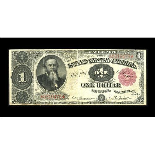 <B>Fr. 349 $1 1890 Treasury Note Fine-Very Fine.</B></I> This Treasury or Coin Note has the scarcer, first back Ornate design for the denomination. Though it has been wet at one time to assist in some ink removal the colors remain bright.