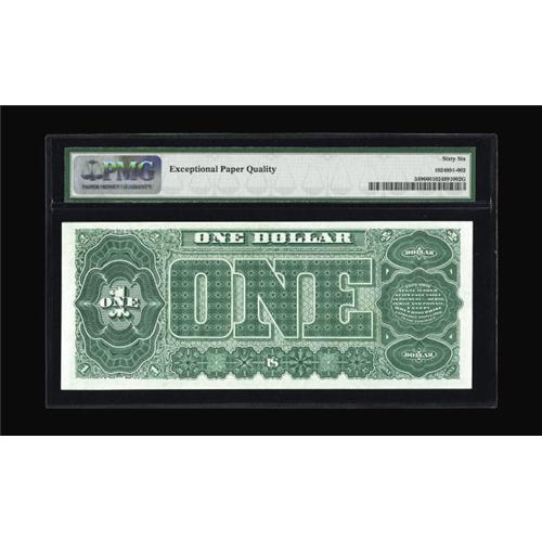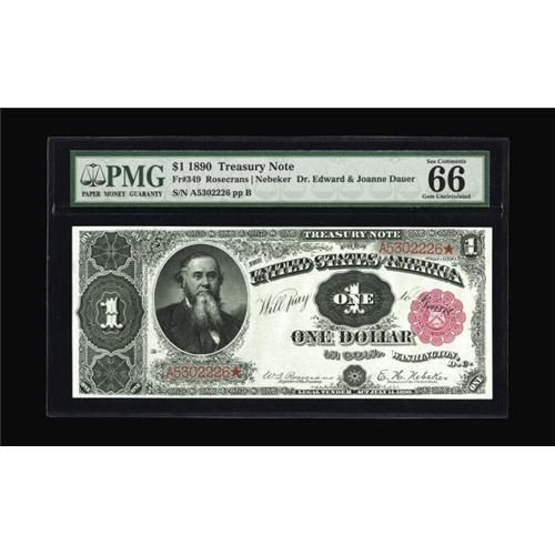 <B>Fr. 349 $1 1890 Treasury Note PMG Gem Uncirculated 66 EPQ.</B></I> A stunningly attractive example of an 1890 Treasury Ace. It appears Superb in every sense save for the right side of the top face margin, which is certainly generous enough to support the Gem grade, but apparently held the note from Superb in PMG's opinion. The color, print quality and paper surfaces are all as good as it gets. Plated on page 213 of Dr. Edward and Joanne Dauer's book, American History as Seen Through Currency.<BR><I>From The Dr. Edward and Joanne Dauer Collection</B></I>