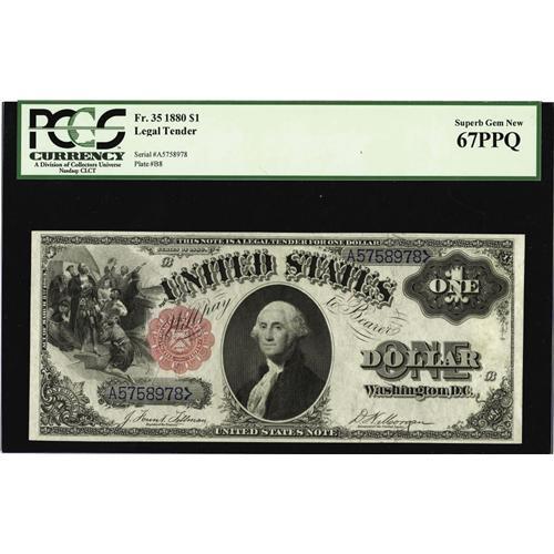 <B>Fr. 35 $1 1880 Legal Tender PCGS Superb Gem New 67PPQ.</B></I> The first time we offered this note for sale, it was not in a third party holder. Unimpeded by the holder, our grade of Superb Gem New was matched with this description, "A note that, although fairly available in high grade, is still worth fussing over. It's hugely margined, strictly original and loaded with deep embossing as well as full flashy color. An impeccable piece of paper that no collector would ever wish to improve upon."<BR><I>From The Jeffrey L. Olyan Collection, Part 1</B></I>