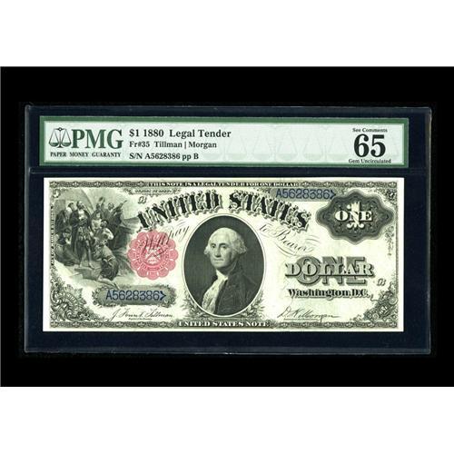 <B>Fr. 35 $1 1880 Legal Tender PMG Gem Uncirculated 65 EPQ.</B></I> We previously offered this note in a sale graded by another third party grading service. PMG has agreed with the grade of Gem. We described it at that time, "A splendid Gem with excellent centering and bright colors. This note is from a run of 100 or so outstanding notes that were saved at the time of issue."<BR><BR><b>Shipping:</b> Coin/Currency (<a target="_blank" href="http://www.heritageauctions.com/common/shipping.php">view shipping information</a>)
