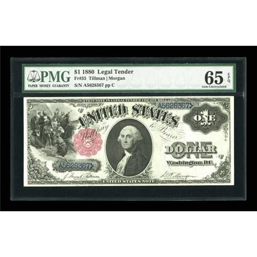 <B>Fr. 35 $1 1880 Legal Tender PMG Gem Uncirculated 65 EPQ.</B></I> A lovely example of this always popular type, with good paper originality, bright colors and excellent margins. No longer seen with regularity in this grade, as many are tightly held.<BR><BR><b>Shipping:</b> Coins & Currency (<a target="_blank" href="http://www.heritageauctions.com/common/shipping.php">view shipping information</a>)