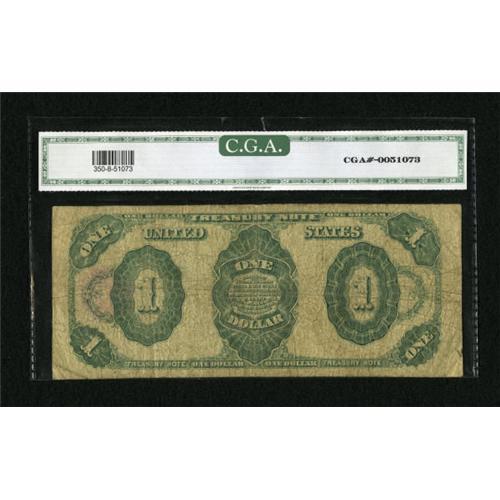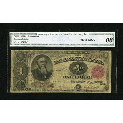 <B>Fr. 350 $1 1891 Treasury Note CGA Very Good 08.</B></I> The paper shows some pinholes and roughness in the top edge, but is otherwise fully detailed and decent for the grade. <BR><BR><b>Shipping:</b> Coins & Currency (<a target="_blank" href="http://www.heritageauctions.com/common/shipping.php">view shipping information</a>)