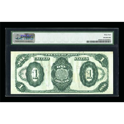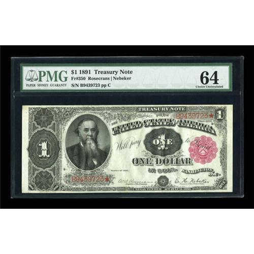 <B>Fr. 350 $1 1891 Treasury Note PMG Choice Uncirculated 64.</B></I> The corners are sharp on this lovely Stanton Ace which delivers rich color. It's the scarcest of the trio of Friedberg numbers for the issue.<BR><BR><b>Shipping:</b> Coins & Currency (<a target="_blank" href="http://www.heritageauctions.com/common/shipping.php">view shipping information</a>)