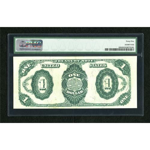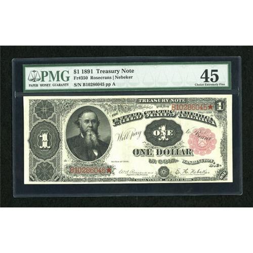 <B>Fr. 350 $1 1891 Treasury Note PMG Choice Extremely Fine 45.</B></I> Solid margins are seen on this three fold Treasury Note. The corners are all sharp and the serial numbers remain brightly colored.<BR><BR><b>Shipping:</b> Coins & Currency (<a target="_blank" href="http://www.heritageauctions.com/common/shipping.php">view shipping information</a>)