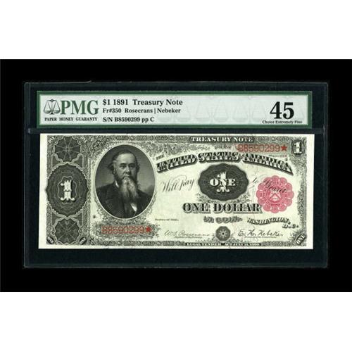 <B>Fr. 350 $1 1891 Treasury Note PMG Choice Extremely Fine 45.</B></I> This three-fold Ace has eye appeal sufficient of a full AU, including vivid colors.<BR><BR><b>Shipping:</b> Coins & Currency (<a target="_blank" href="http://www.heritageauctions.com/common/shipping.php">view shipping information</a>)