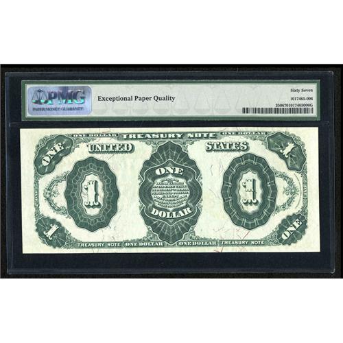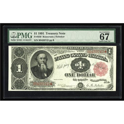 <B>Fr. 350 $1 1891 Treasury Note PMG Superb Gem Unc 67.</B></I> This strictly original Treasury Ace is by far the scarcest signature combination of the three 1891 numbers. The note has all its original embossing, huge face margins, fully bright colors of the ink and paper, and tons of eye appeal.