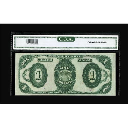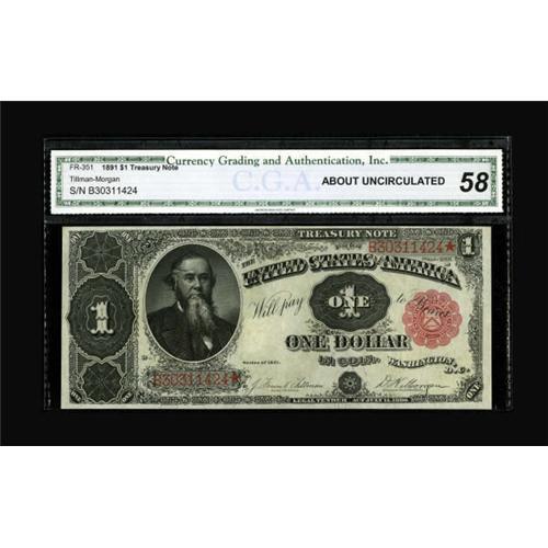 <B>Fr. 351 $1 1891 Treasury Note CGA About Uncirculated 58.</B></I> A lone fold is noted on the right end of the note. <BR><BR><b>Shipping:</b> Coins & Currency (<a target="_blank" href="http://www.heritageauctions.com/common/shipping.php">view shipping information</a>)