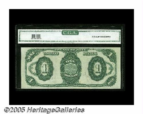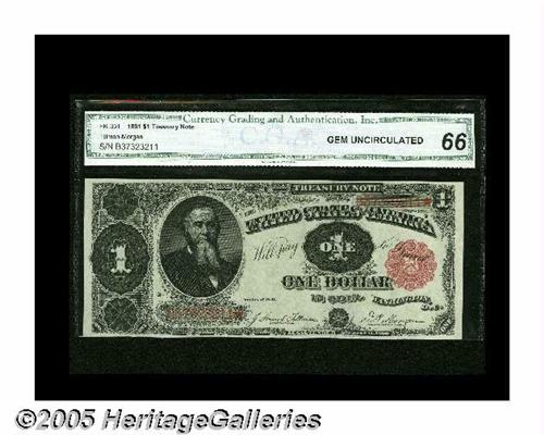 <B>Fr. 351 $1 1891 Treasury Note CGA Gem Uncirculated 66.</B></I> Bright, fresh and clearly original. The note has wonderful color, broad margins and an eye appeal that clearly indicates its earned its 66 grade.
