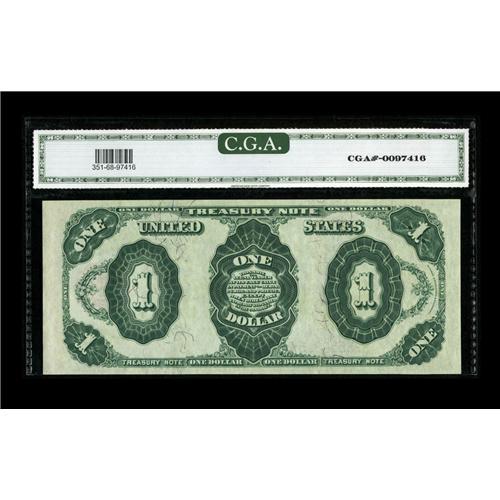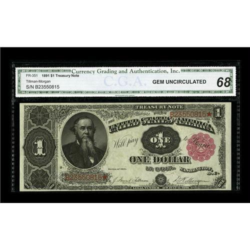 <B>Fr. 351 $1 1891 Treasury Note CGA Gem Uncirculated 68.</B></I> Though unlisted in the census, the serial number on this piece falls right in line with a run of CU pieces. The color is fully sufficient for a Superb grade as is the brightness of the paper.