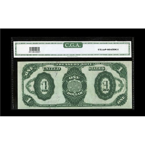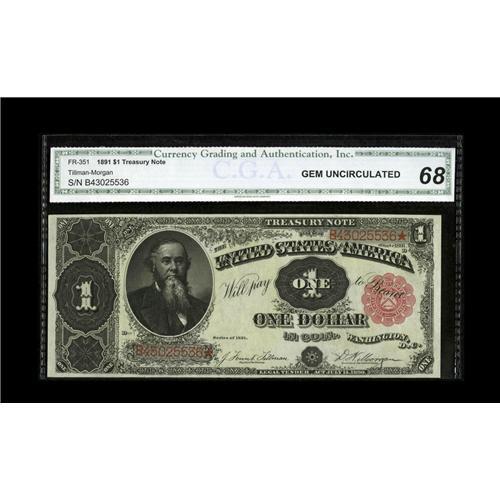 <B>Fr. 351 $1 1891 Treasury Note CGA Gem Uncirculated 68.</B></I> Bright paper and dark inks are traits of this nicely margined $1 Coin note.