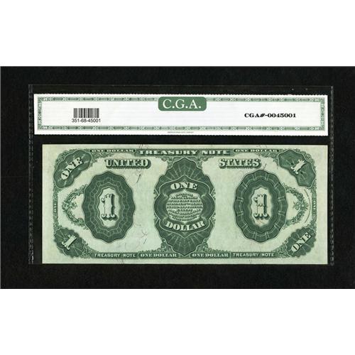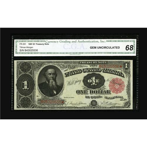 <B>Fr. 351 $1 1891 Treasury Note CGA Gem Uncirculated 68.</B></I> It has been over three years since this note has appeared at auction. The margins are enormous and some of the best seen for the type. The colors and centering are also quite good. This note certainly would fill a void in the collection it enters.<BR><BR><b>Shipping:</b> Coin/Currency (<a target="_blank" href="http://www.heritageauctions.com/common/shipping.php">view shipping information</a>)