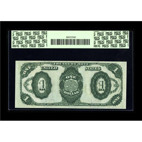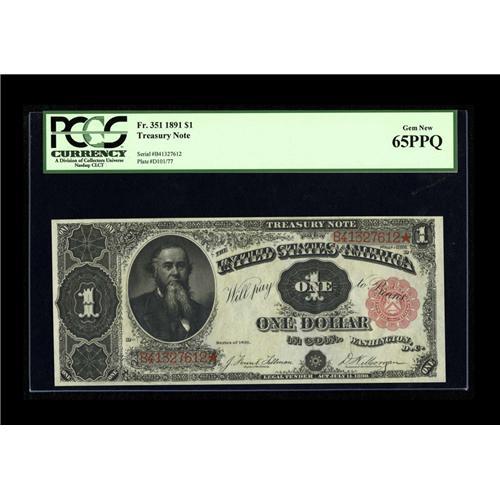 <B>Fr. 351 $1 1891 Treasury Note PCGS Gem New 65PPQ.</B></I> Incredible embossing of the seal and serial numbers is noted in the open white spaces of the back. Adequate margins are noted, though a little more at top and this Treasury Note would have garnered a higher grade.<BR><BR><b>Shipping:</b> Coin/Currency (<a target="_blank" href="http://www.heritageauctions.com/common/shipping.php">view shipping information</a>)