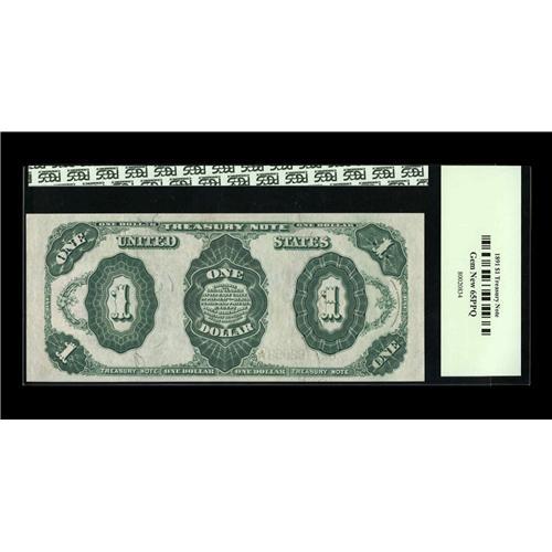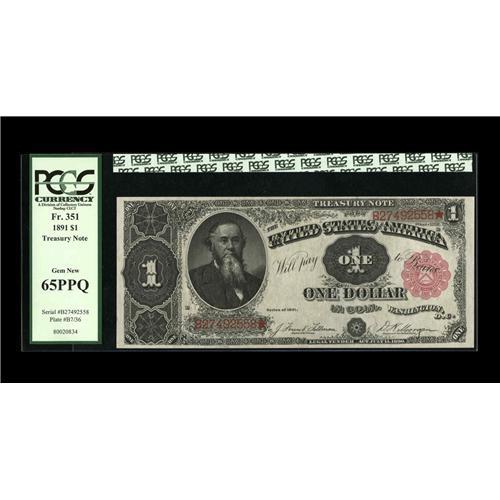 <B>Fr. 351 $1 1891 Treasury Note PCGS Gem New 65PPQ.</B></I> This radiant Coin Note is simply stunning with plenty of embossing present. The top margin is just a bit too tight for a higher grade.