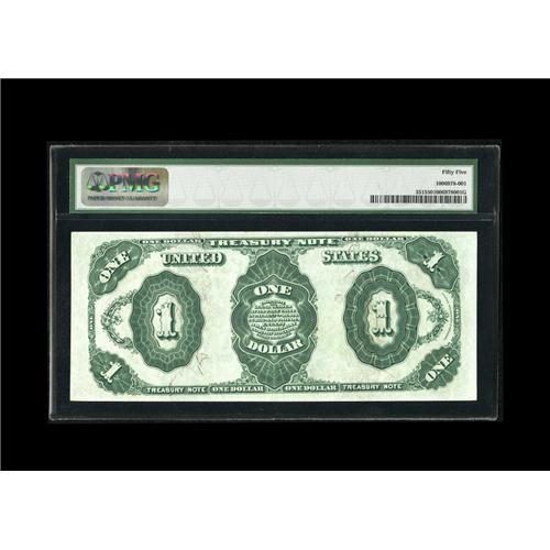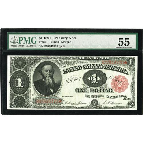 <B>Fr. 351 $1 1891 Treasury Note PMG About Uncirculated 55.</B></I> This pleasing Stanton last appeared in our 2006 Central States sale. The paper is bright, margins are broad, and the color is perfect.