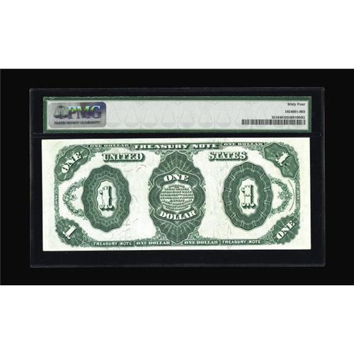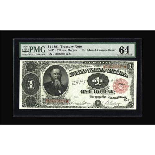 <B>Fr. 351 $1 1891 Treasury Note PMG Choice Uncirculated 64.</B></I> A very nice 1891 Stanton Ace, with good color and decent centering. The top margin does come a bit close at the left end, which probably accounts for the 64 grade. This note is photographed on page 214 of the Dauer book, which also has a short bio of Stanton, Lincoln's second Secretary of War. This lovely piece will likely prove to be the most affordable of the Dauer Treasury notes.<BR><I>From The Dr. Edward and Joanne Dauer Collection</B></I>