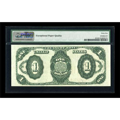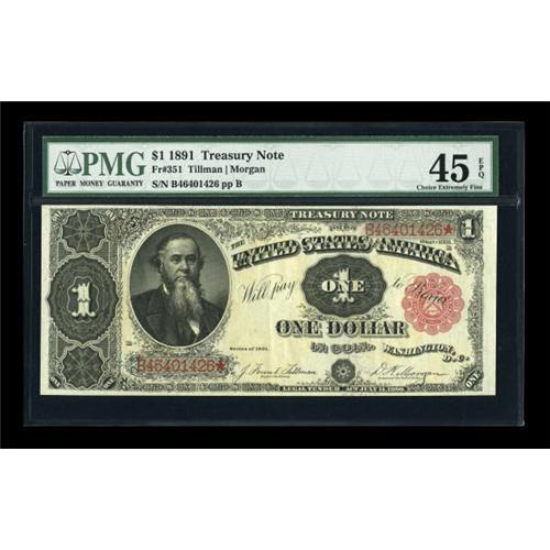 <B>Fr. 351 $1 1891 Treasury Note PMG Extremely Fine 45 EPQ.</B></I> Prominent embossing is seen, attesting to the originality of this popular Coin Note.<BR><BR><b>Shipping:</b> Coins & Currency (<a target="_blank" href="http://www.heritageauctions.com/common/shipping.php">view shipping information</a>)