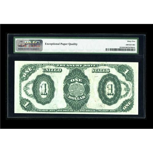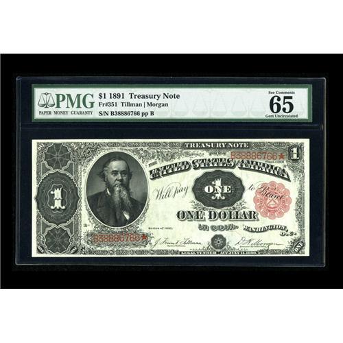 <B>Fr. 351 $1 1891 Treasury Note PMG Gem Uncirculated 65 EPQ.</B></I> This radiant Coin Note is simply stunning with plenty of embossing present. The bottom margin is just a bit too tight for a higher grade.<BR><BR><b>Shipping:</b> Coin/Currency (<a target="_blank" href="http://www.heritageauctions.com/common/shipping.php">view shipping information</a>)