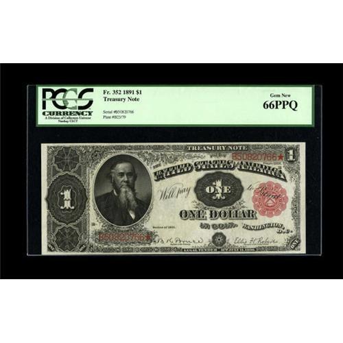 <B>Fr. 352 $1 1891 Treasury Note PCGS Gem New 66PPQ.</B></I> Paper originality that is second to none is noticed. The note is broadly margined all the way around, with wonderful color of the inks and paper, and bold original embossing that is easily seen through the encapsulation.<BR><BR><b>Shipping:</b> Coins & Currency (<a target="_blank" href="http://www.heritageauctions.com/common/shipping.php">view shipping information</a>)