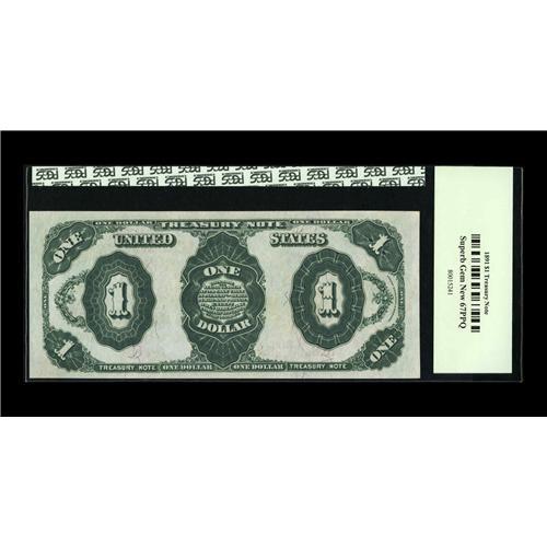 <B>Fr. 352 $1 1891 Treasury Note PCGS Superb Gem New 67PPQ.</B></I> While the major grading services have only been around for less than a year, and no census figures have yet been released, we think it's a very safe bet that few Large Size Type Notes will reach this level. The note is broadly margined all the way around, with wonderful color of the inks and paper, and boldly original embossing that is easily seen through the encapsulation. A truly special note.