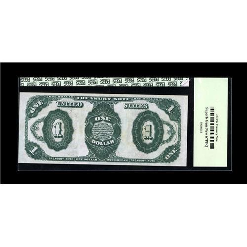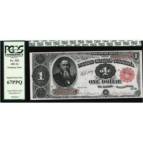 <B>Fr. 352 $1 1891 Treasury Note PCGS Superb Gem New 67PPQ.</B></I> A great note with its embossing, natural paper wave, white paper, and dark inks. The margins are wide for the series and the centering is bull's eye perfect. Hard to imagine a nicer looking Coin Note.