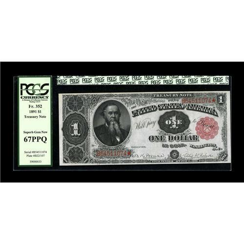 <B>Fr. 352 $1 1891 Treasury Note PCGS Superb Gem New 67PPQ.</B></I> A great note with its embossing, natural paper wave, white paper, and dark inks. The margins are wide for the series and the centering is bull's eye perfect. It is hard to imagine a nicer looking Coin Note.<BR><BR><b>Shipping:</b> Coin/Currency (<a target="_blank" href="http://www.heritageauctions.com/common/shipping.php">view shipping information</a>)