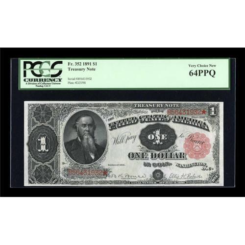<B>Fr. 352 $1 1891 Treasury Note PCGS Very Choice New 64PPQ.</B></I> Bright inks and excellent eye appeal are mainstays of this Ace that just misses gem.<BR><BR><b>Shipping:</b> Coins & Currency (<a target="_blank" href="http://www.heritageauctions.com/common/shipping.php">view shipping information</a>)